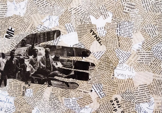 Ještě jednou Jiří Kolář, jehož se dramatické události otřásající Československem bytostně dotýkaly. V té době vytvořil cyklus 66 koláží nazvaný Týdeník 1968.