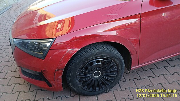 Nehoda ve Zbůchu na Plzeňsku. Řidička přehlédla, že auto před ní odbočuje, a začalo ho předjíždět. Skončila ve zdi domu. (12. ledna 2025)