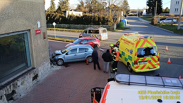 Nehoda ve Zbůchu na Plzeňsku. Řidička přehlédla, že auto před ní odbočuje, a začalo ho předjíždět. Skončila ve zdi domu. (12. ledna 2025)