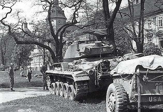 Dobový snímek z osvobození Plzně v květnu 1945.