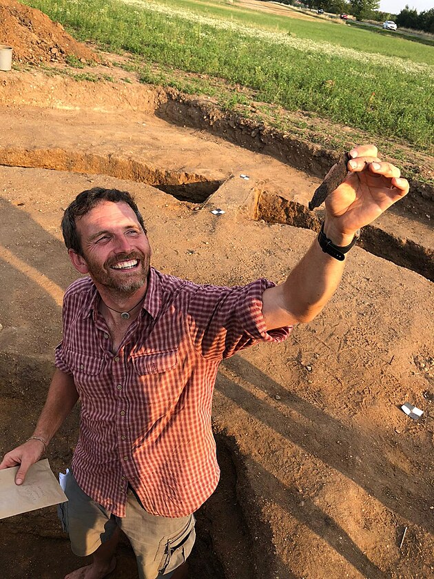 Petr Krištuf, vedoucí výzkumu, ukazuje kamennou čepel nalezenou u hrobu významné ženy u obce Račiněves.