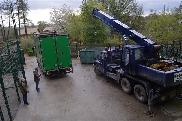 Maruška jede do Francie ve speciálním boxu na přepravu zvířat. Do nákladního automobilu ho musel umístit jeřáb. (26. dubna 2016)