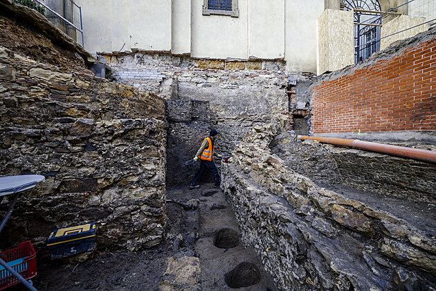 Archeologické práce před kostelem Panny Marie Vítězné.