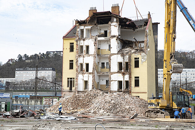 Bourání domu v Nádražní ulici, unikátní fresku s vorařem se z fasády nepodařilo sundat (22. března 2024)