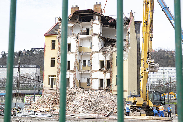 Bourání domu v Nádražní ulici, unikátní fresku s vorařem se z fasády nepodařilo sundat (22. března 2024)