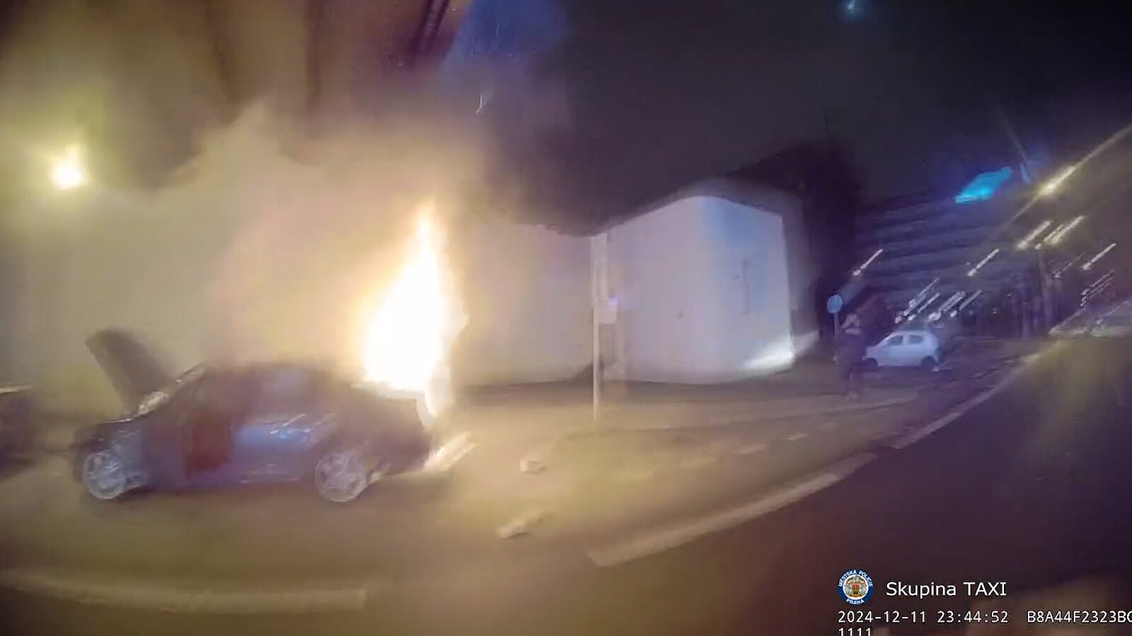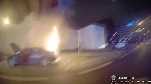 „Jsme u Hiltonu, jak je Husákovo ticho (přezdívka Těšnovského tunelu – pozn. redakce), hoří tu auto. Hasiči jsou zavoláni na místo, v autě byli dva lidi. Z auta vystoupili, nejsou zranění,“ hlásí strážník z Taxi týmu ve videu, které městská policie zveřejnila.