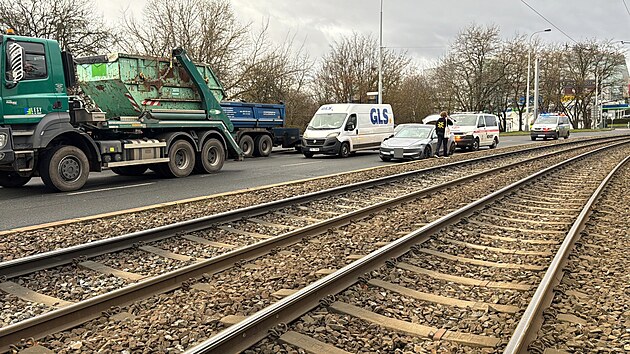 Řidič Tesly v Praze Hostivaři najel do kolejiště tramvaje. Vyprostili ho až autojeřábem. (16. prosince 2024)