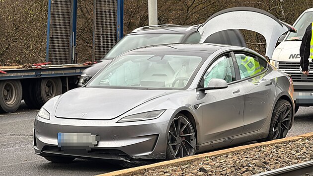Řidič Tesly v Praze Hostivaři najel do kolejiště tramvaje. Vyprostili ho až autojeřábem. (16. prosince 2024)