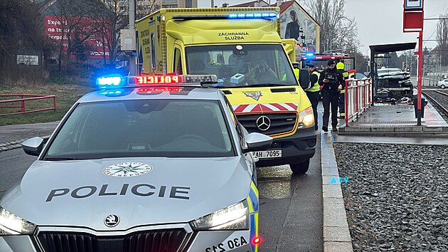 Pražští hasiči zasahují u nehody vozidla, které najelo na tramvajovou zastávku. (23. března 2025)