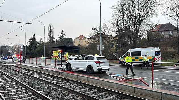 Pražští hasiči zasahují u nehody vozidla, které najelo na tramvajovou zastávku. (23. března 2025)