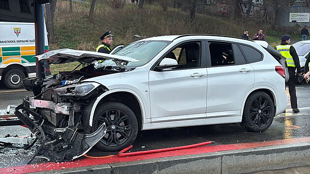 Pražští hasiči zasahují u nehody vozidla, které najelo na tramvajovou zastávku. (23. března 2025)