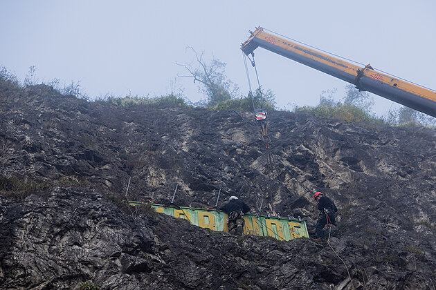Horolezci pomocí jeřábu sundali z Barrandovských skal ikonický nápis BARRANDE z roku 1884. Projde rekonstrukcí. (25. října 2024)