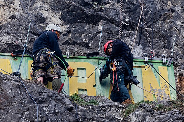 Horolezci pomocí jeřábu sundali z Barrandovských skal ikonický nápis BARRANDE z roku 1884. Projde rekonstrukcí. (25. října 2024)