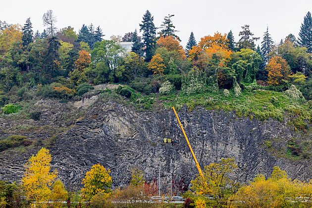 Horolezci pomocí jeřábu sundali z Barrandovských skal ikonický nápis BARRANDE z roku 1884. Projde rekonstrukcí. (25. října 2024)
