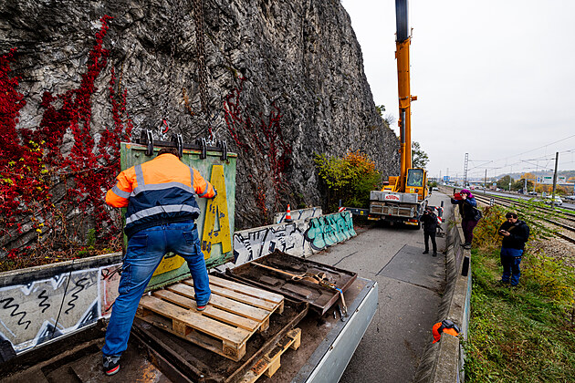Horolezci pomocí jeřábu sundali z Barrandovských skal ikonický nápis BARRANDE z roku 1884. Projde rekonstrukcí. (25. října 2024)