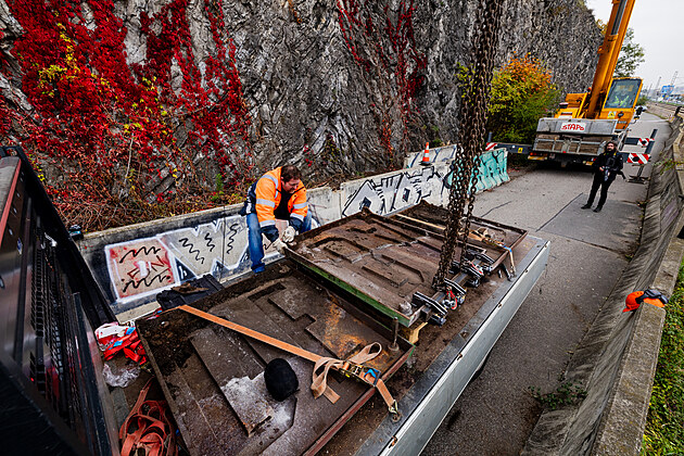 Horolezci pomocí jeřábu sundali z Barrandovských skal ikonický nápis BARRANDE z roku 1884. Projde rekonstrukcí. (25. října 2024)