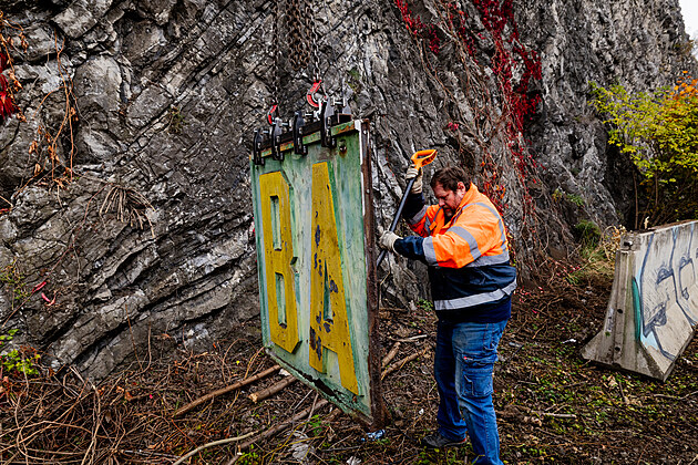 Horolezci pomocí jeřábu sundali z Barrandovských skal ikonický nápis BARRANDE z roku 1884. Projde rekonstrukcí. (25. října 2024)