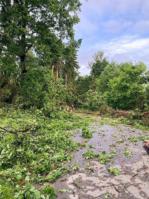 Silnici u Křečovic po bouřce zasypaly stromy, odřízly dvě části obce od sebe. (5. června 2025)