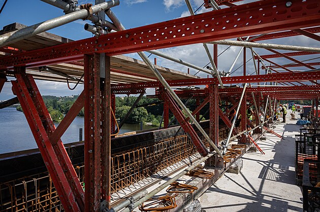 Rekonstrukce železničního Branického mostu. Na snímku vozík pro betonáž římsy. Most se kvůli rekonstrukci a přidání druhé koleje pro vlaky uzavřel. Přidaná kolej by měla zvýšit kapacitu pražského železničního uzlu.