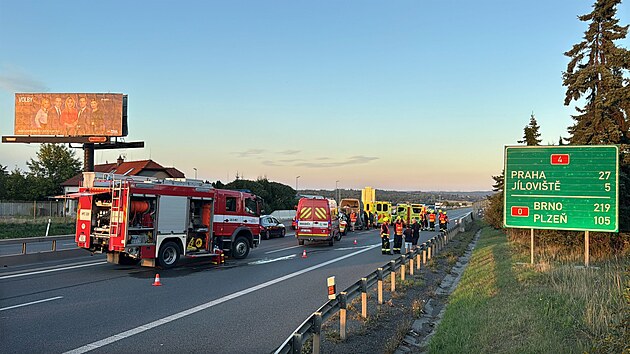 Dálnici D4 zablokovala směrem na Prahu hromadná kolize několika vozidel včetně motocyklu a vozu s přívěsem, v němž byl kůň. (21. září 2025)