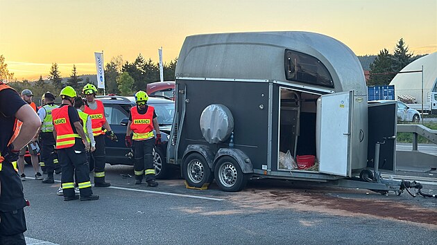 Dálnici D4 zablokovala směrem na Prahu hromadná kolize několika vozidel včetně motocyklu a vozu s přívěsem, v němž byl kůň. (21. září 2025)