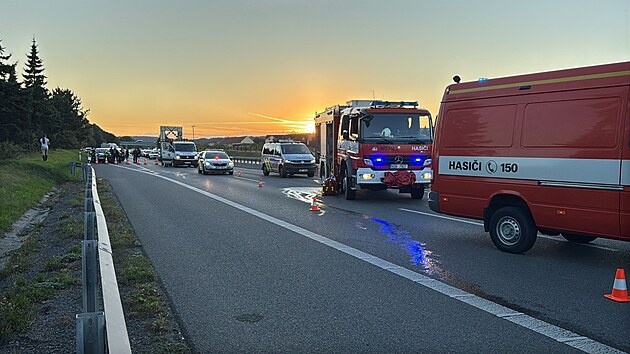 Dálnici D4 zablokovala směrem na Prahu hromadná kolize několika vozidel včetně motocyklu a vozu s přívěsem, v němž byl kůň. (21. září 2025)