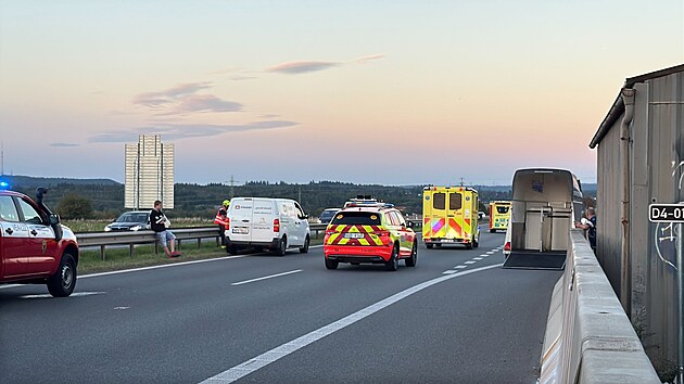 Dálnici D4 zablokovala směrem na Prahu hromadná kolize několika vozidel včetně motocyklu a vozu s přívěsem, v němž byl kůň. (21. září 2025)