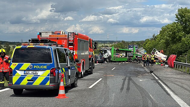 Dálnici D10 ve směru na Turnov uzavřela v pátek dopoledne hromadná nehoda, bourala tři nákladní auta a šest osobních vozů. (23. května 2025)