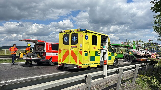 Dálnici D10 ve směru na Turnov uzavřela v pátek dopoledne hromadná nehoda, bourala tři nákladní auta a šest osobních vozů. (23. května 2025)