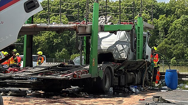 Dálnici D10 ve směru na Turnov uzavřela v pátek dopoledne hromadná nehoda, bourala tři nákladní auta a šest osobních vozů. (23. května 2025)