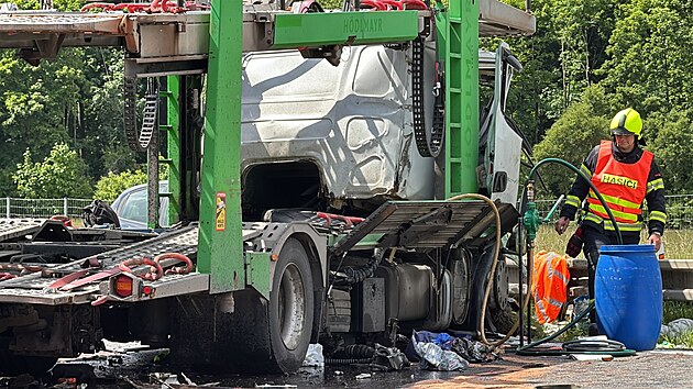 Dálnici D10 ve směru na Turnov uzavřela v pátek dopoledne hromadná nehoda, bourala tři nákladní auta a šest osobních vozů. (23. května 2025)
