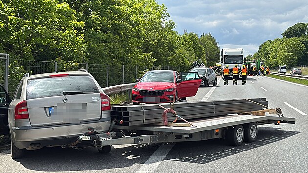 Dálnici D10 ve směru na Turnov uzavřela v pátek dopoledne hromadná nehoda, bourala tři nákladní auta a šest osobních vozů. (23. května 2025)