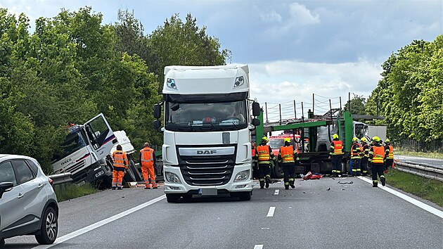 Dálnici D10 ve směru na Turnov uzavřela v pátek dopoledne hromadná nehoda, bourala tři nákladní auta a šest osobních vozů. (23. května 2025)