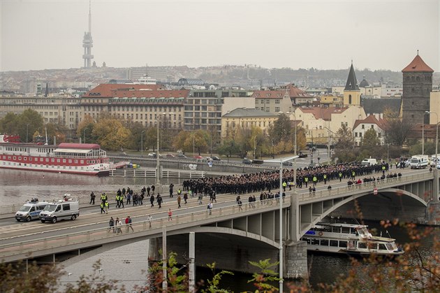 Houf fanoušků fotbalové Slavie za doprovodu policistů pochoduje před derby na stadion Sparty.