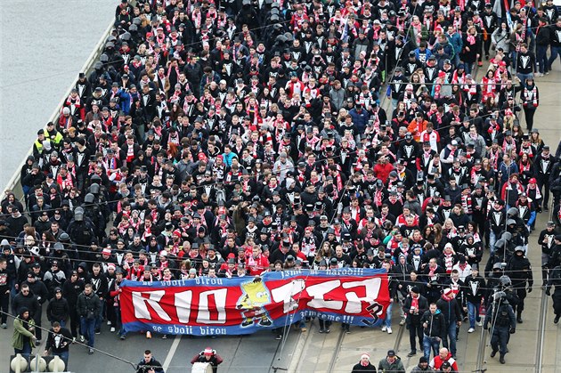 Pochod fanoušků fotbalového klubu Slavia na derby pražských „S“ (20. března 2016)