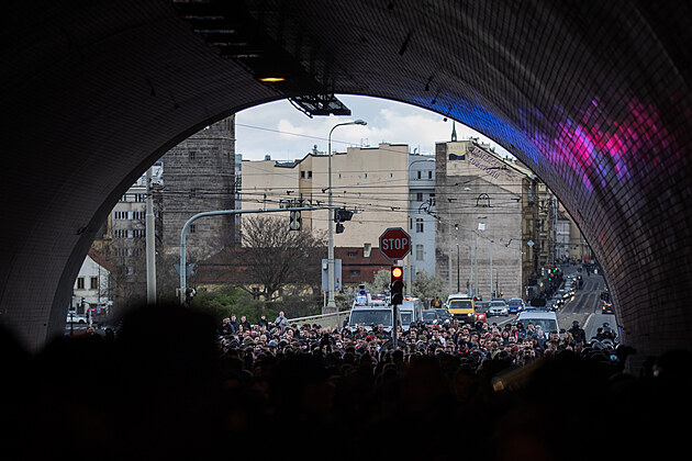 Fanoušci Slavie v Letenském tunelu při pochoduPrahou před utkáním se Spartou