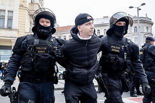 Policisté pacifikují účastníka pochodu fanoušků Slavie Prahou před utkáním se Spartou