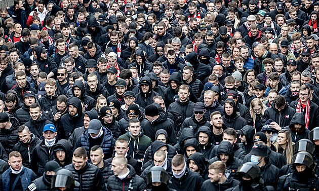 Fanoušci Slavie při pochodu Prahou před utkáním se Spartou