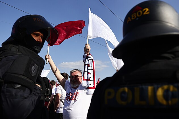 Momentka z pochodu fanoušků Slavie na sparťanský stadion na Letné.