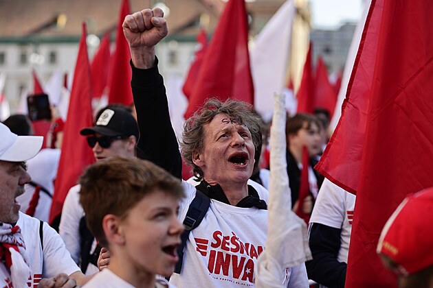 Příznivec fotbalové Slavie zpívá chorály během pochodu na stadion na Letné před finále MOL Cupu se Spartou.