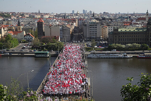 Pochod slávistických fanoušků přes Štefánikův most směrem na Letnou, kde se odehraje finále MOL Cupu se Spartou.