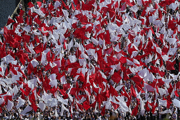 Mraky červených a bílých vlajek v pochodu slávistických fanoušků na Letnou.