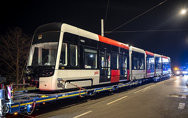 Do Prahy dorazila z plzeňské továrny první tramvaj zcela nového typu. Do Ústředních dílen DPP v Hostivaři ji dopravil obří tahač. (3. dubna 2025)