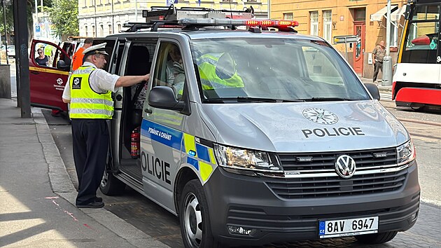 Na zastávce městské hromadné dopravy Smíchovské nádraží narazil v nedělili odpoledne autobus do tramvaje. (20. července 2025)