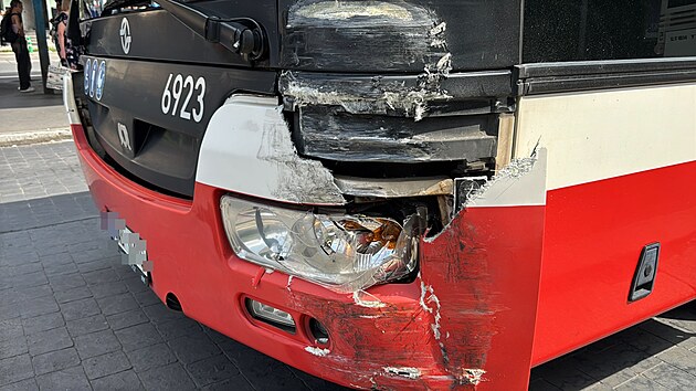 Na zastávce městské hromadné dopravy Smíchovské nádraží narazil v nedělili odpoledne autobus do tramvaje. (20. července 2025)