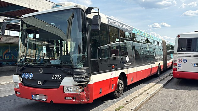 Na zastávce městské hromadné dopravy Smíchovské nádraží narazil v nedělili odpoledne autobus do tramvaje. (20. července 2025)