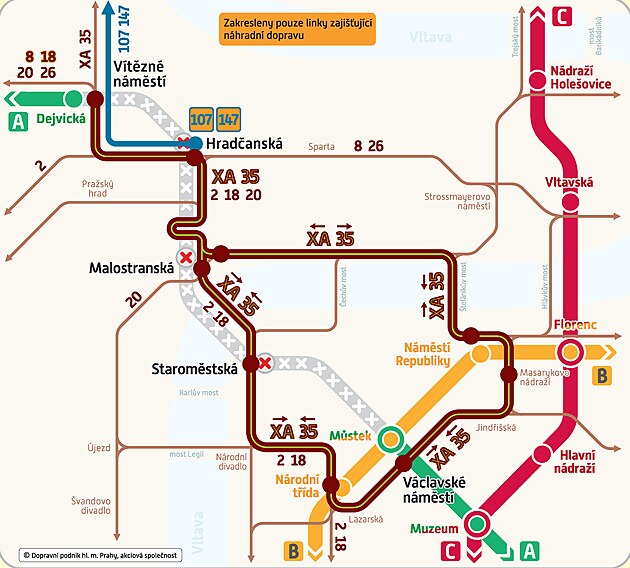 Jako náhradní dopravu zavede tramvajové linky XA a 35, které budou jezdit z Nádraží Podbaba přes Hradčanskou a Malostranskou do centra a zpět. Linka XA projede centrum Prahy přes Staroměstskou, Národní třídu, Masarykovo nádraží a Náměstí republiky, linka 35 pojede opačným směrem přes Náměstí Republiky, Masarykovo nádraží a Národní třídu.