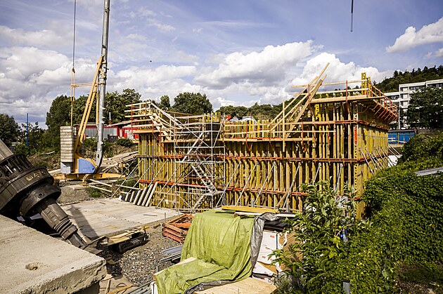 Srpen 2023. Intenzivní betonářské práce na podolské straně mostu