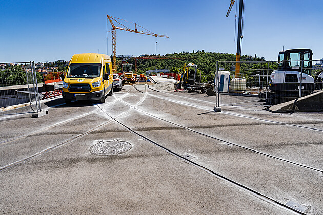 Stavba Dvoreckého mostu se chýlí ke svému konci. Koleje už se pokládají i na samotném mostě, napojení na pražskou tramvajovou síť bylo vybudované na obou březích již v předstihu. (30. června 2025)
