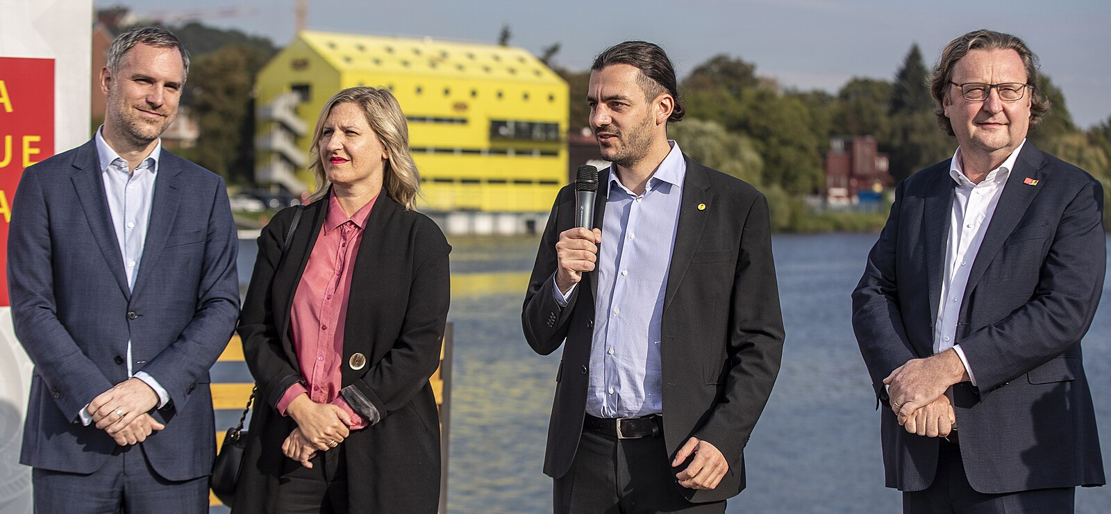 Slavnostní zahájení stavby Dvoreckého mostu přes Vltavu ve Žlutých lázních. Na snímku zleva primátor Zdeněk Hřib, radní Hana Třeštíková, a a náměstek pro dopravu Adam Scheinherr a radní Petr Hlaváček. (13. září 2022)
